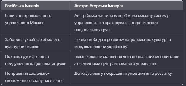 2. Заповнити таблицю: Порівняльна характеристика стану українських земель у складі Російської та Австро-Угорської імперій.