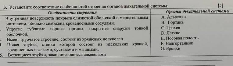 утановите соответствие особенностей строения органов дыхательной системы: Особенности строения ренняя поверхность покрыта слизистой оболочкой с мерцательным елием, обильно снабжена кровеносными сосудами. гие губчатые парные органы, покрытые снаружи тонкой очкой. ет трубчатое строение, состоит из хрящевых полуколец. ая трубка, стенки которой состоят из нескольких хрящей, диненных связками, суставами и мышцами. вящиеся трубки, заканчивающиеся альвеолами [5] Органы дыхательной системы А. Альвеолы В. Гортань С. Трахея D. Легкие Е. Носовая полость F. Надгортанник G. Бронхи