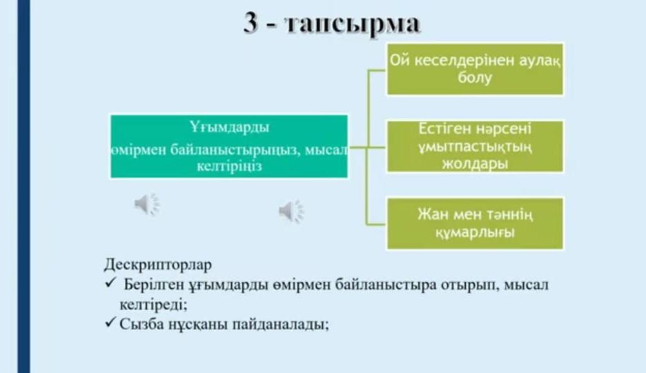 3 - тапсырма Ұғымдарды өмірмен байланыстырыныз, мысал келтiрiнiз Ой кеселдерінен аулак болу Естіген нәрсені ұмытпастыктын жолдары Жан мен тәннiн құмарлығы Дескрипторлар . Берілген ұғымдарды өмірмен байланыстыра отырып, мысал келтіреді; Сызба нұсканы пайданалады