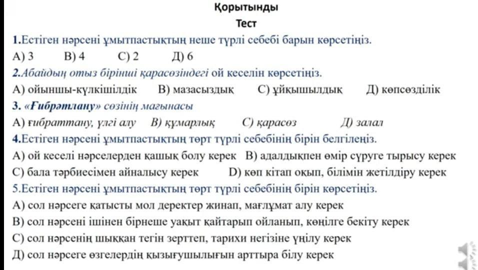 Қорытынды Тест 1.Естіген нәрсені ұмытпастыктын неше түрлі себебі барын көрсетіңіз. A) 3 C) 2 Д) 6 B) 4 2.Абайдың отыз бірінші қарасөзіндегі ой кеселін көрсетіңіз. А) ойыншы-күлкішілдік 3. «Ғибрәтлану» сөзінің мағынасы А) ғибраттану, үлгі алу В) құмарлық С) қарасөз В) мазасыздык С) ұйқышылдык Д) көпсөзділік Д) залал 4.Естіген нәрсені ұмытпастыктын төрт түрлі себебiнiн бiрiн белгiленiз. А) ой кеселі нәрселерден кашык болу керек В) адалдыкпен өмір сүруге тырысу керек С) бала тәрбиесімен айналысу керек D) кеп кітап окып, бiлiмiн жетiлдiру керек 5.Естіген нәрсені ұмытпастыктын төрт түрлі себебiнiң бірін көрсетіңіз. А) сол нәрсеге катысты мол деректер жинап, мағлұмат алу керек В) сол нәрсені ішінен бірнеше уакыт кайтарып ойланып, конiлге бекiту керек С) сол нәрсенiн шыккан тегiн зерттеп, тарихи негiзiне үңілу керек Д) сол нәрсеге өзгелердiн кызығушылығын арттыра білу керек