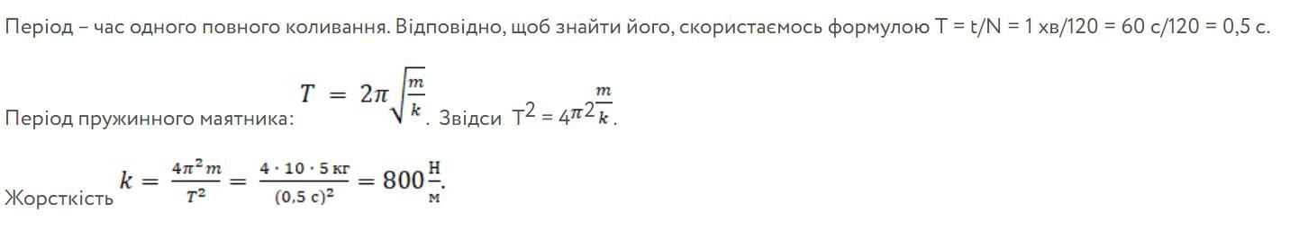 Яка жорсткість пружини, якщо тіло масою 5 кг, підвішене до неї, здійснює 120 коливань за одну хвилину? Значення л² прийняти рівним 10.