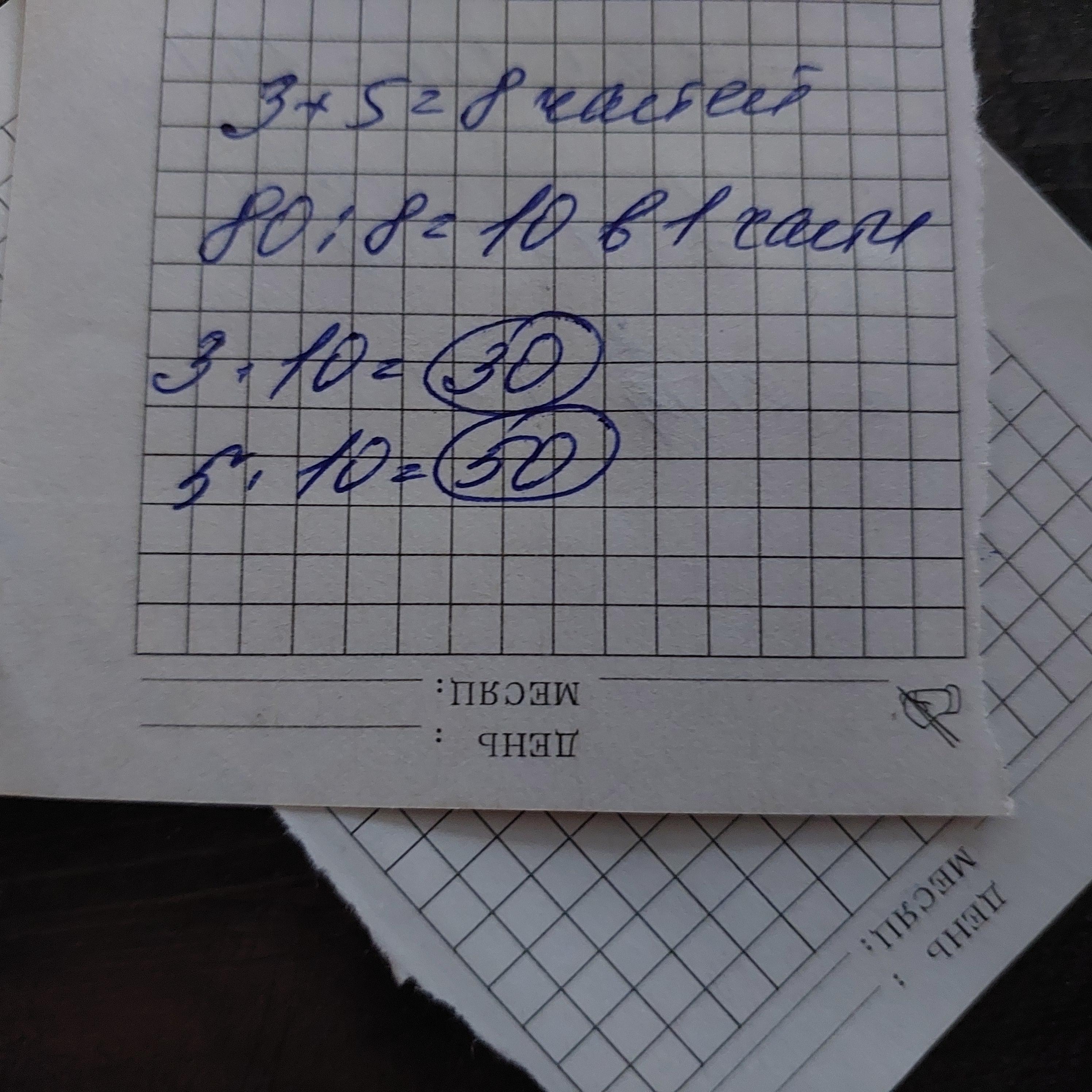 Срочно!!! Поділи число 80 у відношенні 3:5