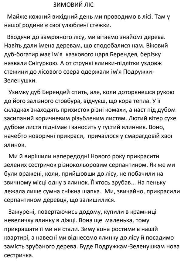 Майже кожні вихідні ми проводимо в лісі. У нашої сім'ї є улюблений маршрут. Коли ми заходимо в омріяний ліс, ми вітаємося зі знайомими деревами. Ми навіть даємо імена нашим улюбленим деревам. Віковий дуб названий на честь казкового царя Беренді, а берізка - Снігуронька. А крихітну ялинку, що росте вздовж дороги до лісового озера, назвали Зеленушкою. Взимку дуб Берендея спить, але якщо доторкнутися рукою до його залізного стовбура, то можна відчути тепло кори. У її складках знаходять притулок різноманітні комахи, а підлога під дубом встелена коричневим різьбленим листям. Шалений вітер піднімає сухе дубове листя і несе його в густий ялиновий ліс. Приховані під смарагдовою хвоєю ялин, вони виглядають як новорічні прикраси. Напередодні Нового року ми вирішили прикрасити наших зелених сестер різнокольоровими стрічками. Яким же було наше здивування, коли, прийшовши до лісу, ми не побачили жодної ялинки на звичному місці... Її хтось зрубав... Лише сумна снігова крона на пеньку. Звичайно, ми прикрасили ялинки, що залишилися, серпантином. На жаль, по дорозі додому ми купили маленьку ялинку в діжці. Ми не прикрашали її, бо вона була ще маленька. Ми виростимо її в квартирі на зиму, а навесні віднесемо до лісу і посадимо замість зрубаної ялинки. У Зеленушки буде нова сестричка.