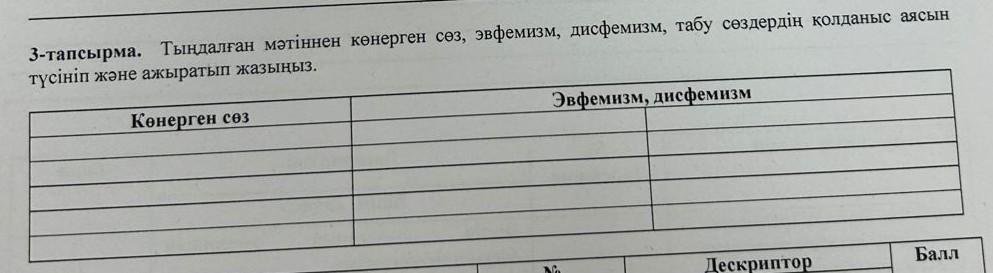 3-тапсырма. Тыңдалған мәтіннен көнерген сөз, эвфемизм, дисфемизм, табу сөздердің колданыс аясын түсініп және ажыратып жазыныз. Көнерген сөз Эвфемизм, дисфемизм Дескриптор Балл