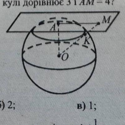Відрізок ОМ перетинає сферу в точці К. Чому дорівнює довжина відрізка МК, якщо радіус кулі дорівнює 3 і AM = 4?