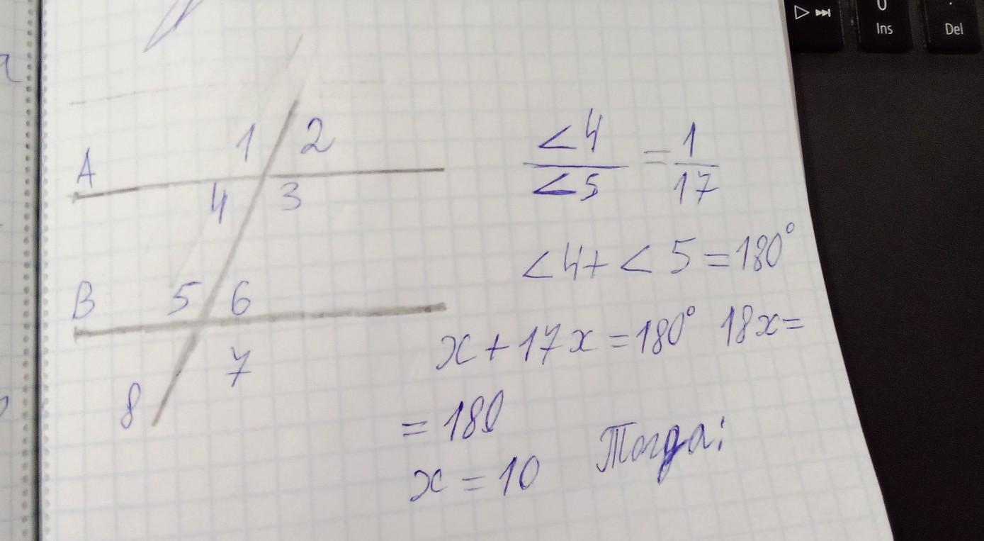 Знайдіть кути при паралельних прямій і січній, якщо внутрішні односторонні кути відносяться, як: 1:17.