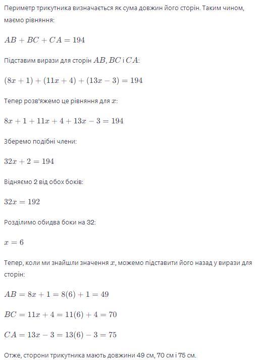 Сторони ΔABC задані виразами AB=8x+1,BC=11x+4,CA=13x−3. Знайди сторони цього трикутника, якщо його периметр дорівнює 194 см.