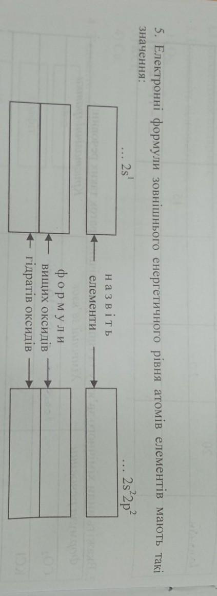 5. Електронні формули зовнішнього енергетичного рівня атомів елементів мають так значення: ... назвіть елементи формули вищих оксидів гідратів оксидів ... 2s²2p² 2. B