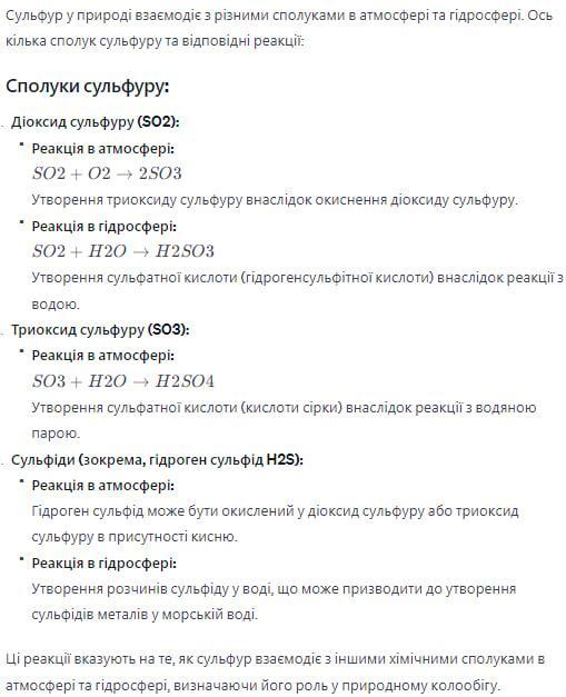 147. Назвіть кілька сполук Сульфуру, які беруть участь у колообігу цього елемента. Наведіть приклади відповідних реакцій, що від- буваються в атмосфері та гідросфері.