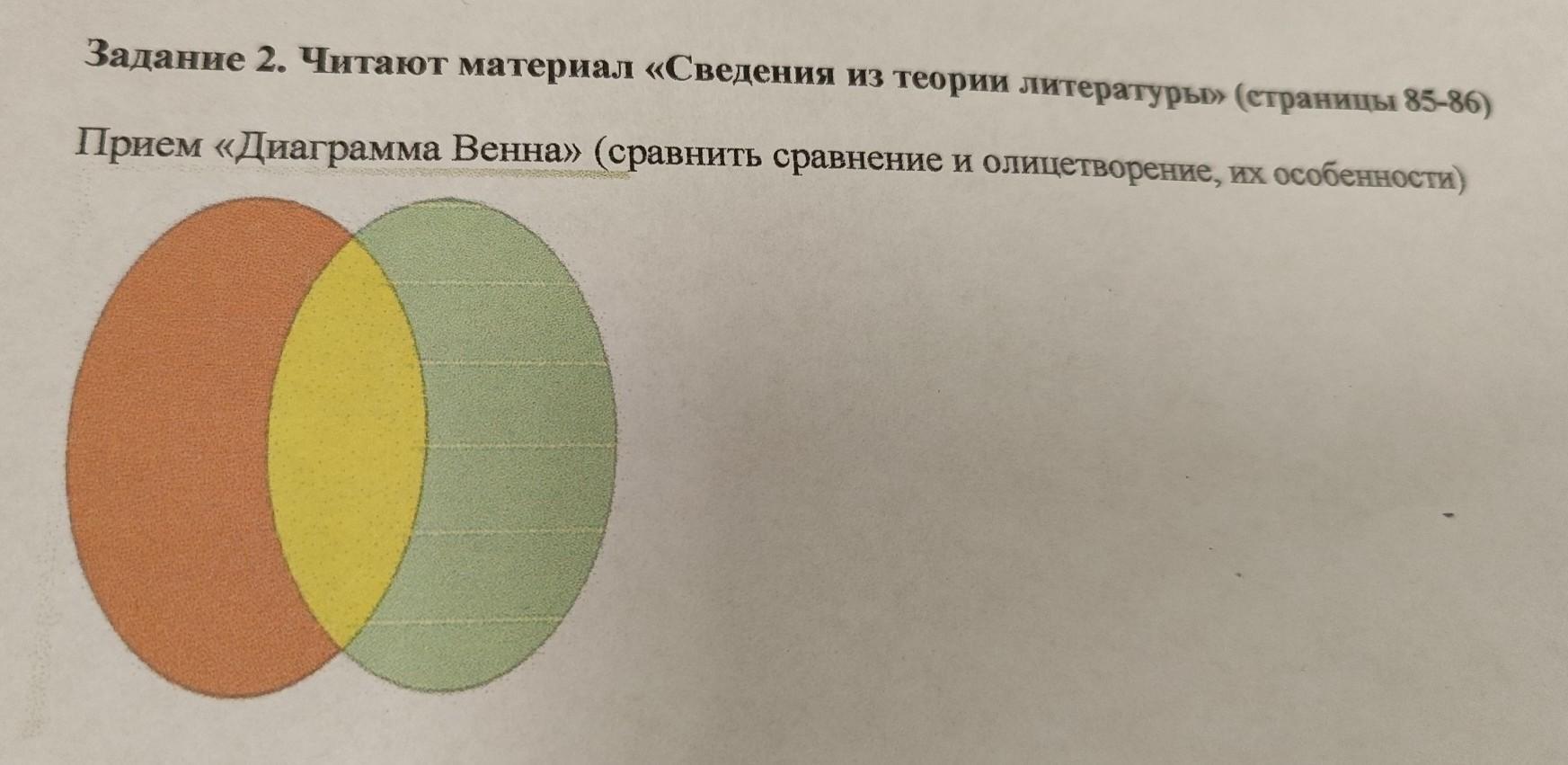 Задание 2. Читают материал «Сведения из теории литературы» (страницы 85-86) Прием «Диаграмма Венна» (сравнить сравнение и олицетворение, их особенности)