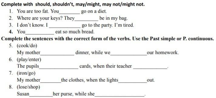 1. should, 2. may, 3. may not, 4. shouldn't. 5. was cooking; were doing. 6. were playing; entered, 7. was ironing; went, 8. lost; shopping.
