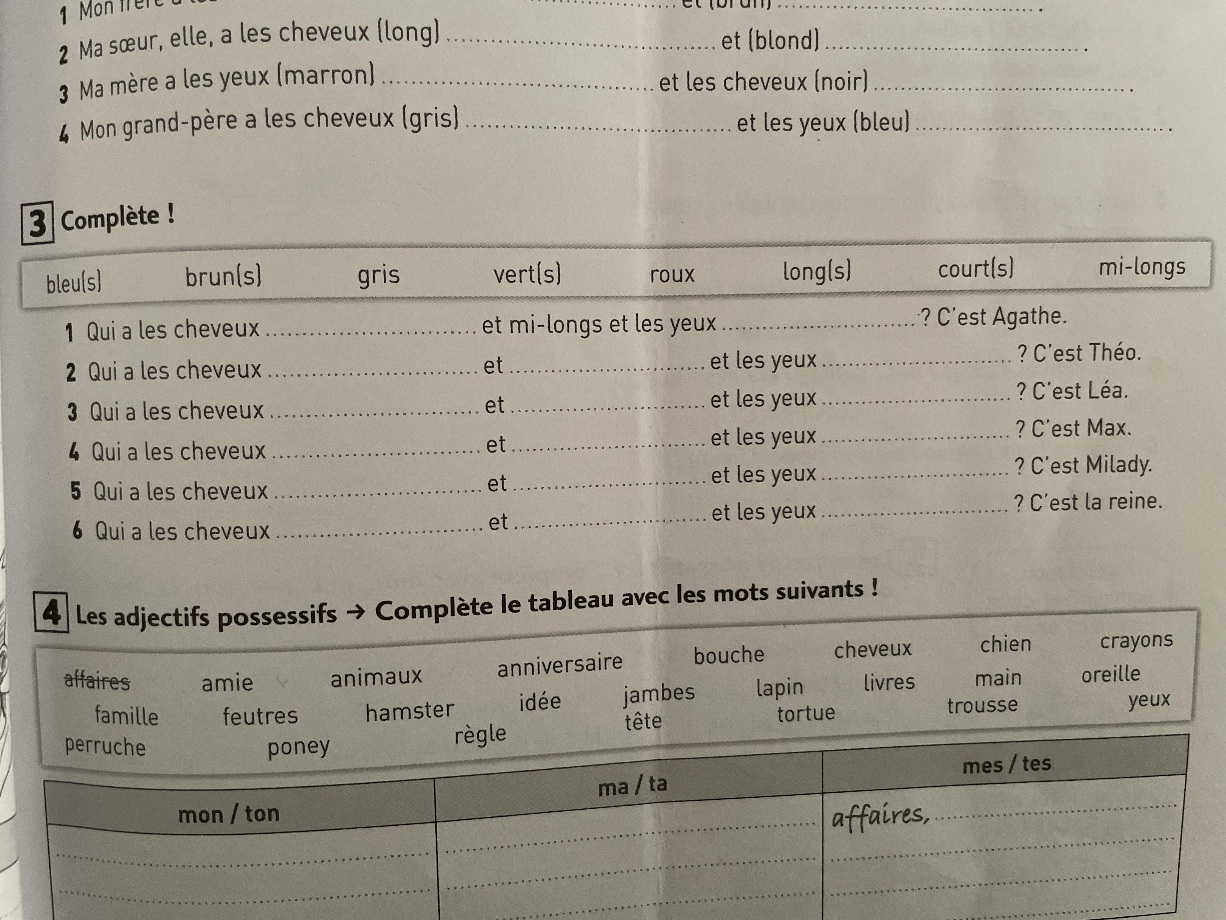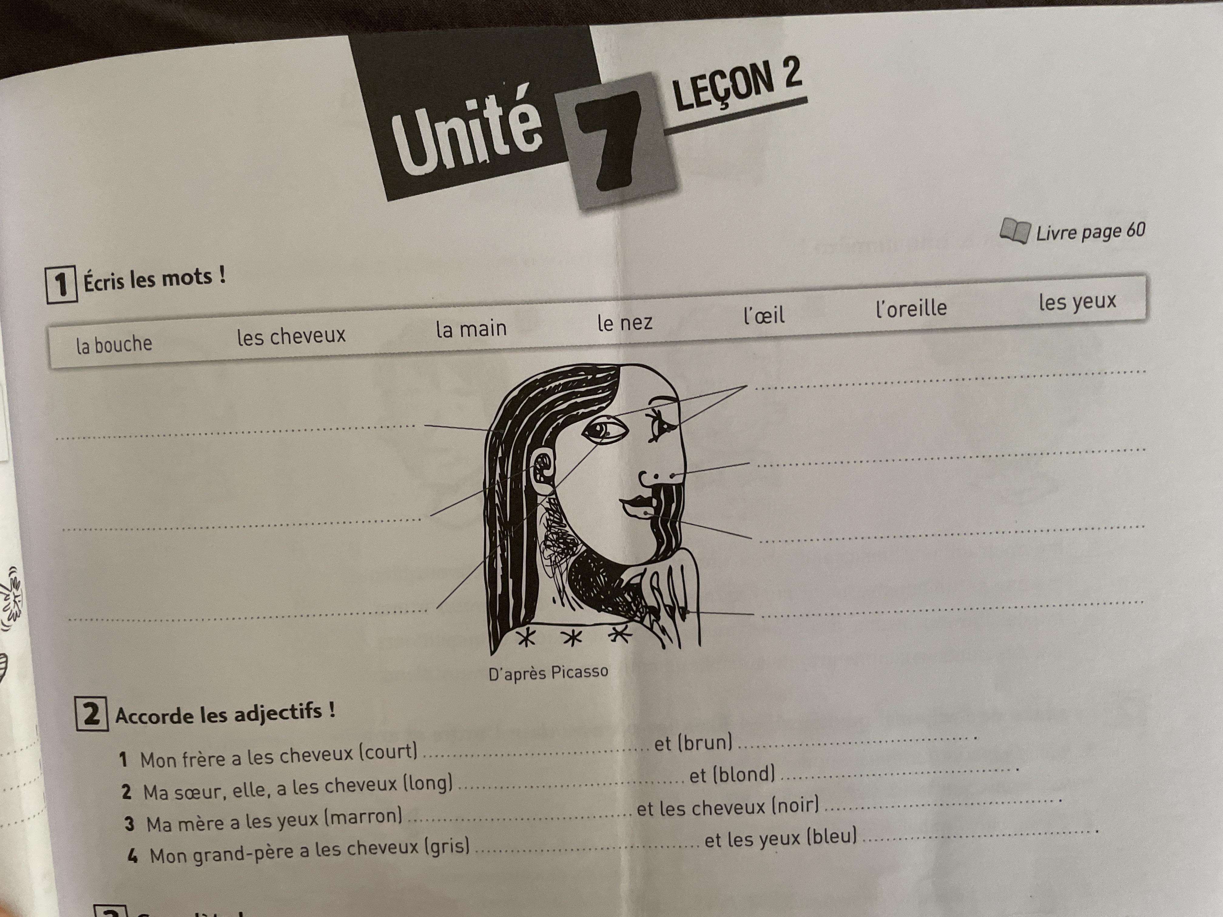 1. слава в таком порядке: les cheveux, l'oreille, l'oeil
