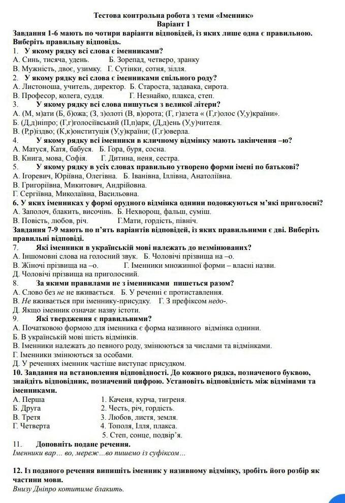 Тестова контрольна робота з теми «Іменник>> Варіант 1 Завдання 1-6 мають по чотири варіанти відповідей, iз яких лише одна є правильною. Виберіть правильну відповідь. 1. У якому рядку всі слова є iменниками? А. Синь, тисяча, удень. Б. Зорепад, четверо, зранку В. Мужність, двоє, узимку. Г. Сутінки, сотня, зілля. 2. У якому рядку всi слова є iменниками спільного роду? А. Листоноша, учитель, директор. Б. Староста, задавака, сирота. Г. Незнайко, плакса, степ. У якому рядку всі слова пишуться з великої літери, В. Професор, колега, суддя. 3. А. (М,м)ати (Б, б)ожа; (3, 3)олоті (в, в)орота; (Г, г)азета « (Г,г)олос (У,у)країни». Б. (Д,д)нiпро; (Г,г)голосіївський (П,п)арк, (Д,д)ень (У,у)чителя. В. (P,p)iздво; (К,к)онституція (У,у)країни; (Г,г)оверла. 4. У якому рядку всi iменники в кличному відмінку мають закiнчення -ю? А. Матуся, Катя, бабуся. Б. Гора, буря, сосна. В. Книга, мова, Софія. Г. Дитина, неня, сестра. 5. У якому рядку в усіх словах правильно утворено форми iменi по батькові? А. Ігоревич, Юріївна, Олегівна. Б. Іванівна, Іллівна, Анатоліївна. В. Григоріївна, Микитович, Андрiйовна. Г. Сергіївна, Миколаївна, Васильовна. 6. У яких іменниках у формі орудного вiдмiнка однини подовжуються м'якi приголосні? А. Заполоч, блакить, височінь. Б. Нехворощ, фальш, суміш. В. Повість, любов, рiч. Г.Мати, гордість, пiвнiч. Завдання 7-9 мають по п'ять варіантiв вiдповiдей, із яких правильними є дві. Виберіть правильнi вiдповіді. 7. Які іменники в українській мові належать до незмiнюваних, А. Іншомовні слова на голосний звук. Б. Чоловічі прізвища на -о. В. Жіночi прiзвища на -о Д. Чоловічі прізвища на приголосний. 8. Г. Іменники множинної форми - власні назви. За якими правилами не з iменниками пишеться разом? А. Слово без не не вживається. Б. У реченні є протиставлення. В. Не вживається при iменнику-присудку. Г. З префіксом недо-. Д. Якщо iменник означає назву істоти. 9. Які твердження є правильними? А. Початковою формою для iменника є форма називного вiдмiнка однини. Б. В УКРАЇНСЬКІй мовi шiсть вiдмiнкiв. В. Іменники належать до певного роду, змінюються за числами та вiдмiнками. Г. Іменники змінюються за особами. Д. У реченнях iменник частіше виступає присудком. 10. Завдання на встановлення відповідності. До кожного рядка, позначеного буквою, знайдіть відповідник, позначений цифрою. Установіть вiдповiднiсть мiж вiдмiнами та iменниками. А. Перша Б. Друга В. Третя Г. Четверта 1. Каченя, курча, тигреня. 2. Честь, рiч, гордість. 3. Любов, листя, земля. 4. Тополя, Ілля, плакса. 5. Степ, сонце, подвір'я. 11 Доповнİть подане речення. Іменники вар... во, мереж...во пишемо із суфіксом... 12. Із поданого речення випишіть iменник у називному відмінку, зробіть його розбiр як частини мови. Внизу Днiпро котитиме блакить.