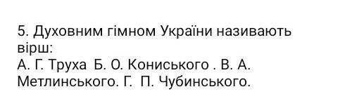 5. ДУХОВНИМ Гімном України називають вірш: А. Г. Труха Б. О. Кониського . В. А. Метлинського. Г. П. Чубинського.