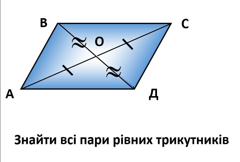 Відповідь: ΔBOC = ΔDOA; ΔBOA =ΔDOC; ΔABC =ΔCDA; ΔBCD =ΔDAB