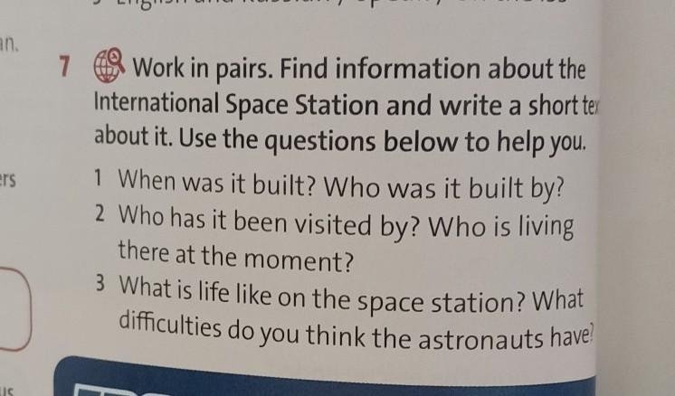 s7 Work in pairs. Find information about the International Space Station and write a short tex about it. Use the questions below to help you. 1 When was it built? Who was it built by? 2 Who has it been visited by? Who is living there at the moment? 3 What is life like on the space station? What difficulties do you think the astronauts have?