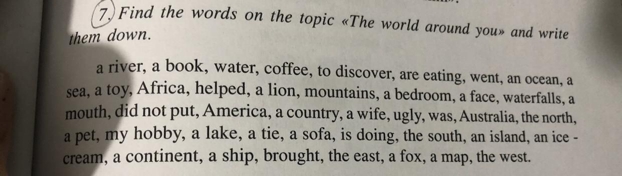 a river, a book, water, coffee, to discover, are eating, went, an ocean, a