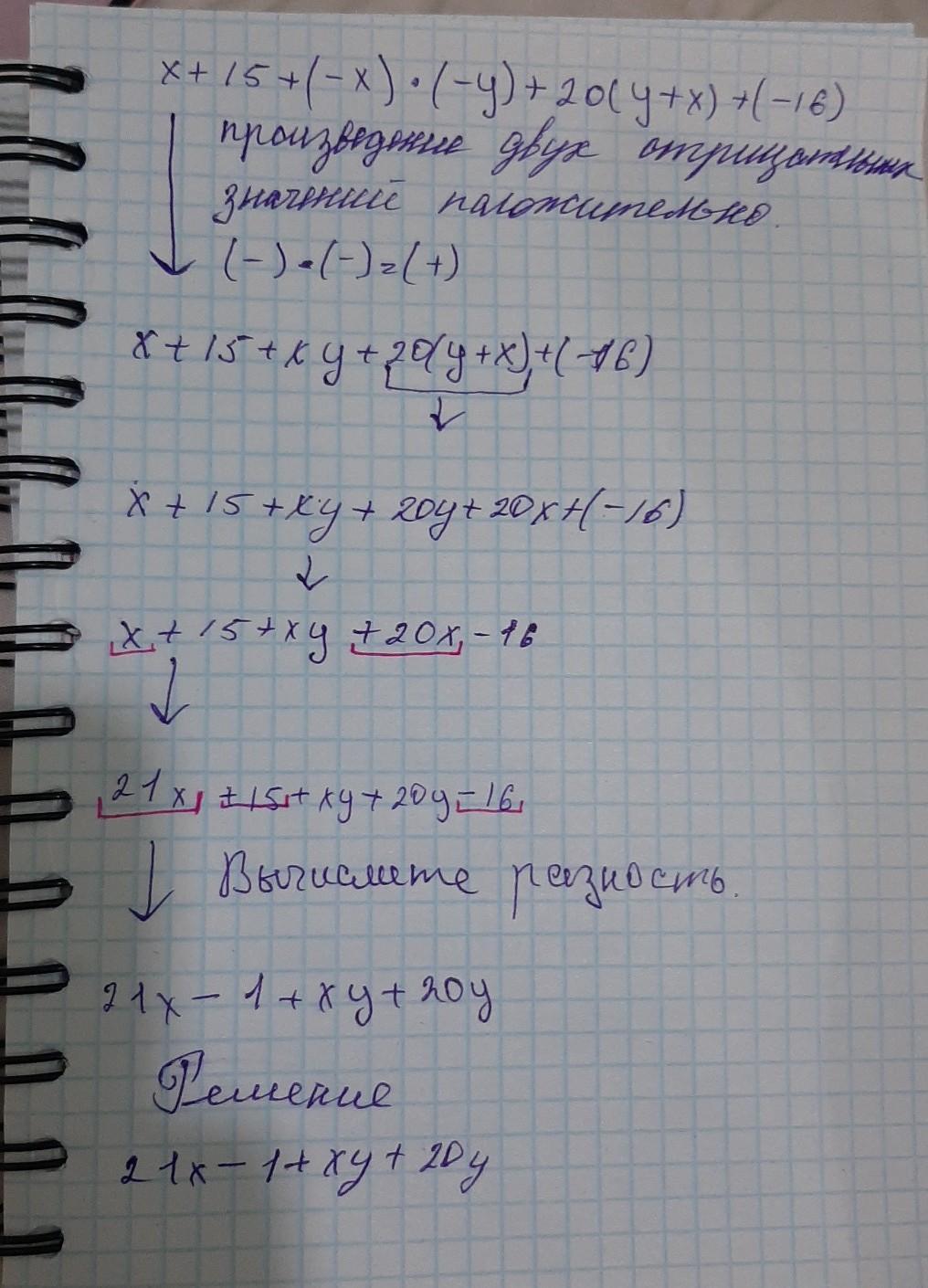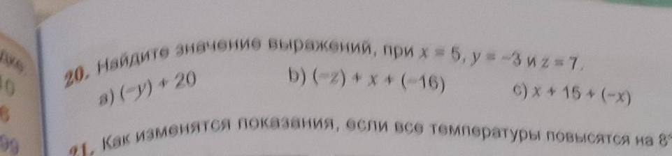 адке: 10 20. Найдите значение выражений, при x = 5, у = -3 и 2 = 7. c) x + 15 + (-x) a) (-y) + 20 b) (~z) + x + (-16)