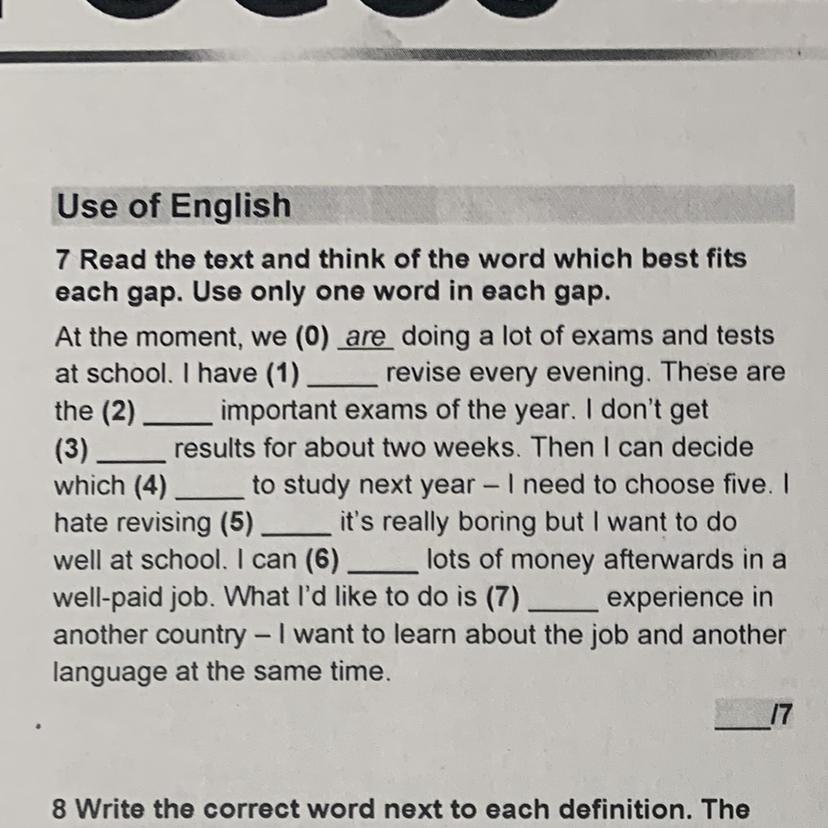 1.to 2.most 3.exam 4.group 5.history(или любой предмет который тебе не нравится) 6.earn 7.to have