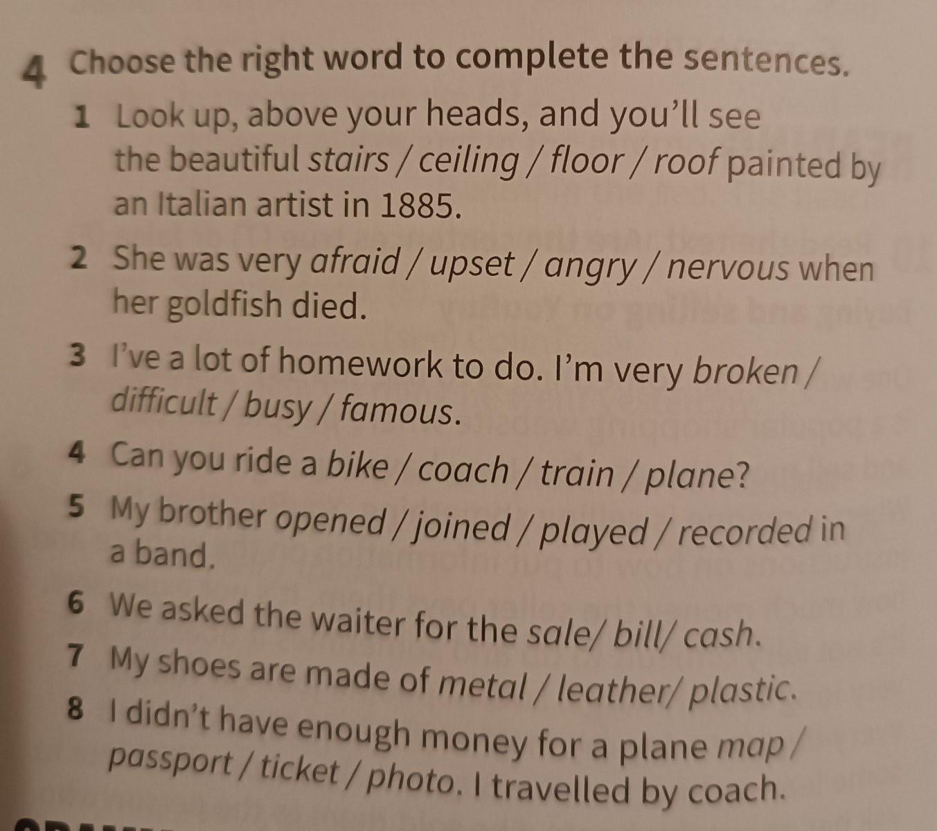 1 celling 2 upset 3 busy 4 bike 5 played 6 bill 7 leather 8 ticket