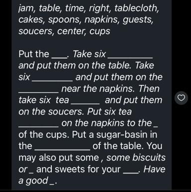 1 table, 2 napkins, 3 sources, 4 cups, 5 spoons, 6 right, 7 center, 8 jam, 9 cakes, 10 guests, 11 time