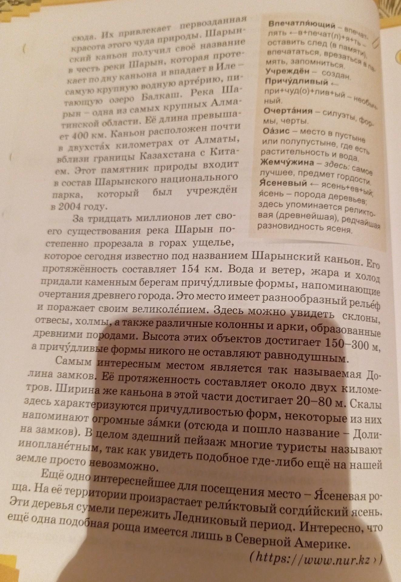 3. 1) Ответьте на вопросы. 1. О каких водоёмах идёт речь в тексте? 2. В чём своеобразие Шарынского каньона? 3. Где он расположен? 4. Почему эту местность называют пустынным оазис