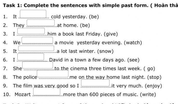 Task 1: Complete the sentences with simple past form. (Hoàn cold yesterday. (be) ...at home. (be) him a book last Friday. (give) a movie yesterday evening. (watch) .a lot last winter. (snow) 1. It 2. 3. 4. We 5. It 6. I 7. She 8. The police 9. The film was very good so I. 10. Mozart They I David in a town a few days ago. (see) to the cinema three times last week. (go) me on the way home last night. (stop) ..it very much. (enjoy) ...more than 600 pieces of music. (write)