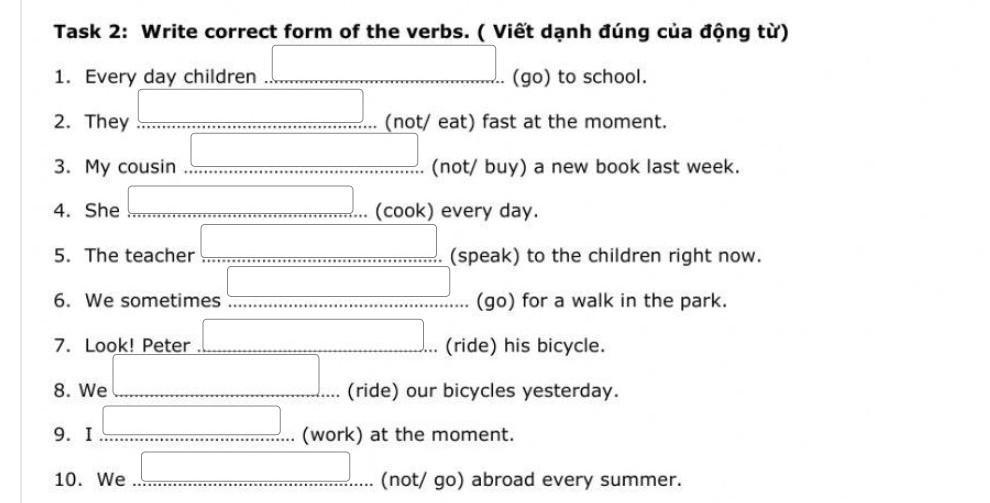 Task 2: Write correct form of the verbs. ( Viết dạnh đúng của động từ) 1. Every day children (go) to school. 2. They (not/ eat) fast at the moment. 3. My cousin 4. She 5. The teacher 6. We sometimes 7. Look! Peter 8. We 9. I 10. We (not/ buy) a new book last week. (cook) every day. (speak) to the children right now. (go) for a walk in the park. (ride) his bicycle. (ride) our bicycles yesterday. (work) at the moment. (not/ go) abroad every summer.