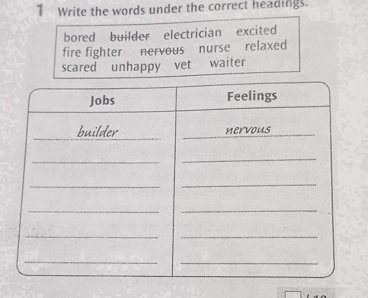 Vocabulary 1 Write the words under the correct headings. bored builder electrician excited fire fighter nervous nurse relaxed scared unhappy vet waiter Jobs builder Feelings nervous /10