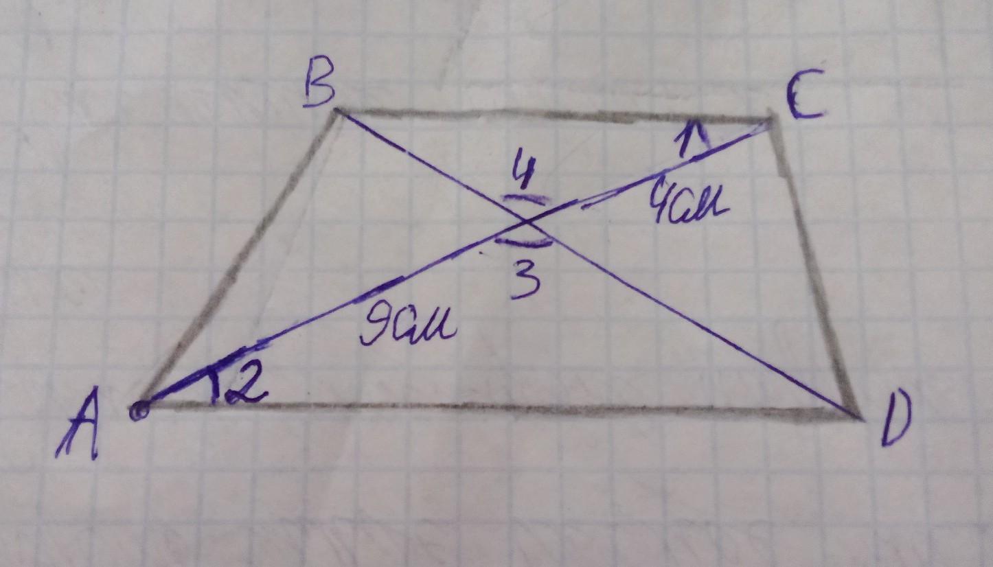Дано: ABCD это сама трапеция. АО=9 см, ОС=4см, АD-ВС=25 см, AD? BC?