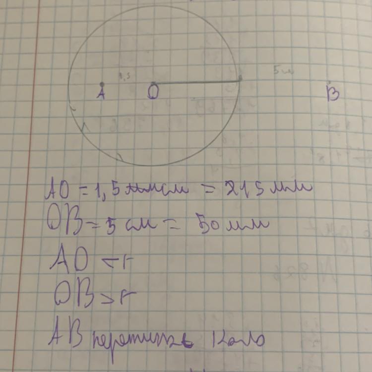 . Накресли круг із центром у точці О, радіус якого 25 мм. Познач точку А, що належить кругу і не лежить на колі, яке обмежує круг, 1 точку В, яка не належить кругу. Виміряй відстані ОА ОВ порівняй їх з радіусом. Чи перетинає відрізок АВ ко