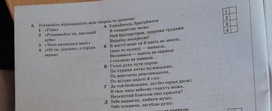 6. Установіть відповідність між твором та цитатою. Гiмн 1 2 •Розвивайся ти, високий 3 4 А Єднаймося, братаймося В товариство чесне. Най братерством, щирими трудами Вкраїна воскресне! 6 в житті мене ти й знать не знаешь, Ідеш по вулиці Вклонюся - I головою не кивнеш... в Голос духа чути скрiзь: По курних хатах мужицьких, По верстатах ремісницьких, По мiсцях недолі й сліз. г Де той безбожник, що без серця дрожi В твое лице небесне глянуть може, Неткнутий блиском твоï красоти? д тебе видаючи, любити мушу. Тебе кохаючи, загублю душу. дубе. . Чого являешся менi. .Ой ти, дiвчино, з горіха зерня минаеш, навіть не зирнеш