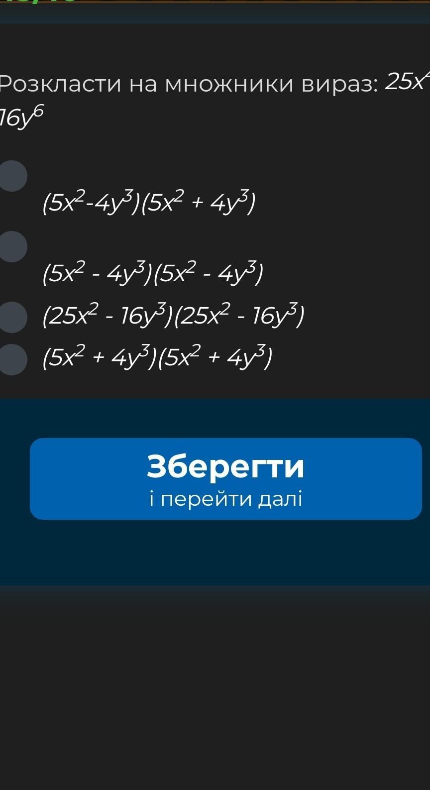 Розкласти на множники вираз: 25x4 . 16уб (5x²-4y3)(5x2 + 4,3) (5x2 - 4y3)(5x2 - 4,3) (25x² - 16y3)(25x² - 16y3) (5х2 +4y3)(5x2 +4+3)