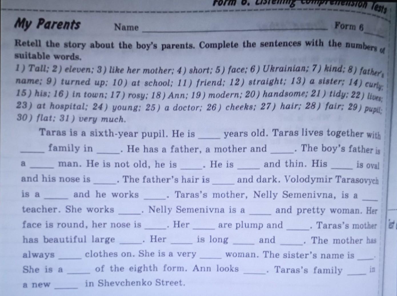 Retell the story about the boy's parents. Complete the sentences with the numbers of suitable words. 1) Tall; 2) eleven; 3) like her mother; 4) short; 5) face; 6) Ukrainian; 7) kind; 8) father' name; 9) turned up; 10) at school; 11) friend; 12) straight; 13) a sister; 14) curly: 15) his; 16) in town; 17) rosy; 18) Ann; 19) modern; 20) handsome; 21) tidy: 22) lives: 23) at hospital; 24) young; 25) a doctor; 26) cheeks; 27) hair; 28) fair; 29) pupil; 30) flat; 31) very much. Taras is a sixth-year pupil. He is family in a man. He is not old, he is and his nose is is a teacher. She works face is round, her nose is has beautiful large always She is a a new He has a father, a mother and He is . The father's hair is and he works . years old. Taras lives together with The boy's father is is oval . and thin. His and dark. Volodymir Tarasovych Taras's mother, Nelly Semenivna, is a Nelly Semenivna is a . Her Her clothes on. She is a very of the eighth form. Ann looks in Shevchenko Street. are plump and and woman. The sister's name is Taras's family is long and pretty woman. Her Taras's mother The mother has in. СРОЧНО ПОМОГИТЕ ДАЮ 100 БАЛЛОВ