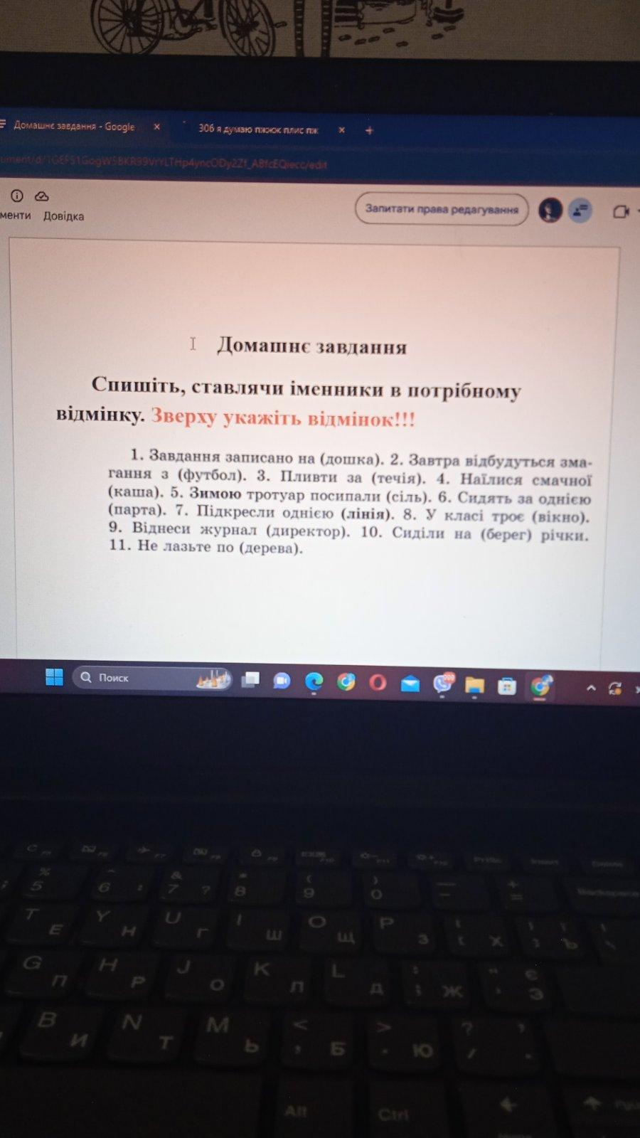 на дошці (на кому на чому *можливо ДАВАЛЬНИЙ* ), з футболу (з кого чого *можливо РОДОВИЙ*), течією (за ким чим *можливо ОРУДНИЙ), каші (чого кого РОДОВИЙ), сіллю (ким чим. ОРУДНИЙ ВІД.), партою(ким чим ОРУДНИЙ), лінією(ким чим ОРУДНИЙ), вікон (кого чого РОДОВИЙ), директору (кому чому ДАВАЛЬНИЙ), березі(кого чого РОДОВИЙ), деревам(кому чому ДАВАЛЬНИЙ)