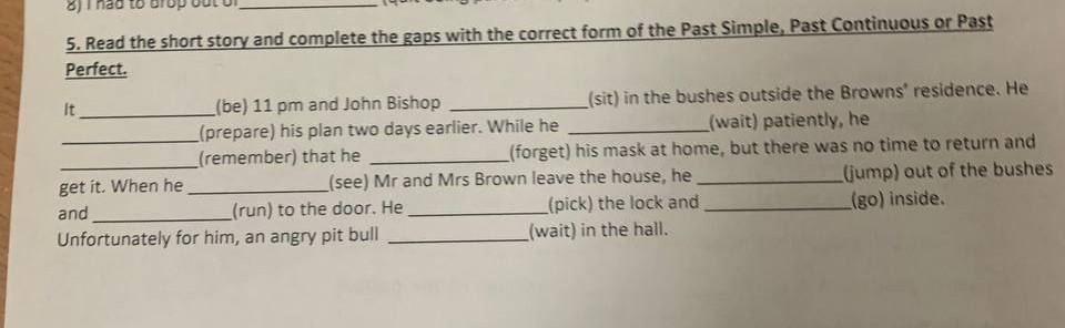 It was 11 p.m. and john bishop was sitting in the bushes outside the browns residence. He had prepared his plan two days earlier. When he saw Mr and Mrs brown leaving the house, he jumped out of the bushes and ran to the door. He picked the lock and went inside. unfortunately for him, an angry pitbull was waiting in the hall.