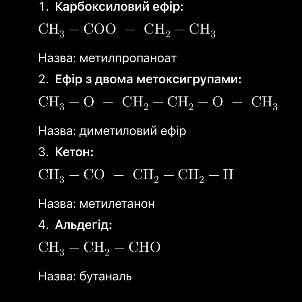 Складіть напівструктурні формули ізомерів складу C4H8O2. Назвіть їх відповідно до правил сучасної української номенклатури. Вкажіть види ізомерії