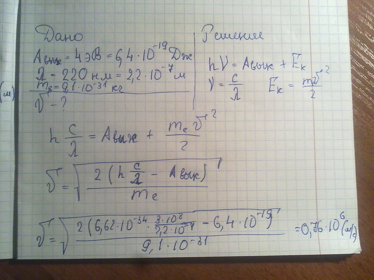 Помогите пожалуйста!На цинковую пластину,работа выхода которой Авых=4эв,падает монохроматический свет длиной волны лямда=220 нм. Определите максимальную скорость фотоэлектронов.Спасибо)