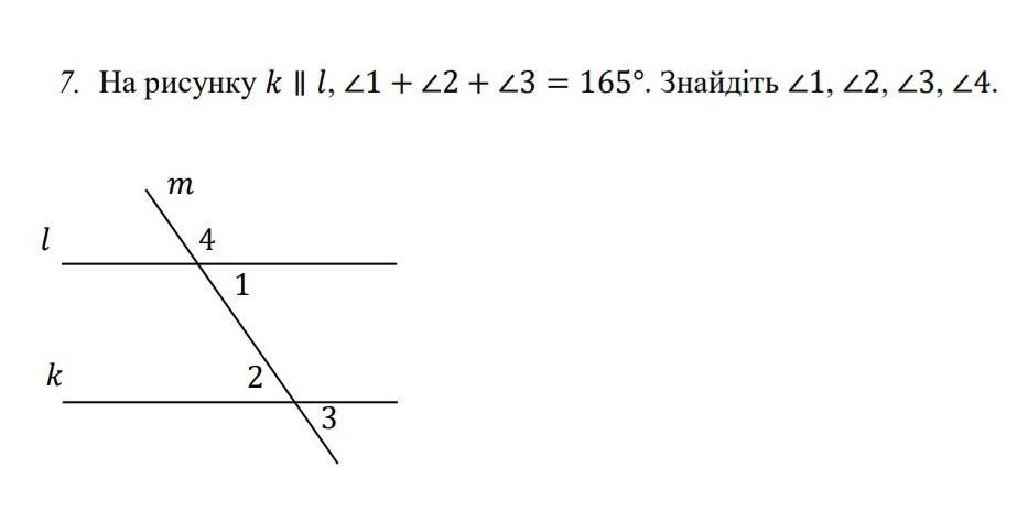 7. Ha pисункy k || L, кут 1 + кут 2 + кут 3 = 165°. Знайдіть кут 1, кут 2, кут 3, кут 4.