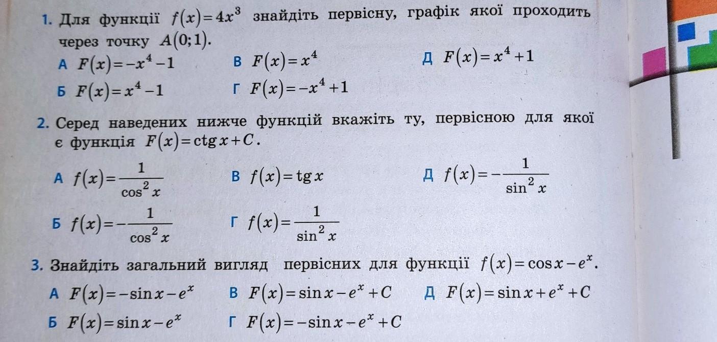 Тест № 2 1. Для функції f(x)=4x³ знайдіть первісну, графік якої проходить через точку А(0;1). A F(x)=-x1-1 д F(x)=x² +1 5 F(x)=x²-1 2. Серед наведених нижче функцій вкажіть ту, первісною для якої є функція F(x)=ctgx+C. A f(x)= 1 cos²x B_F(x)= x4 г F(x)=-x4+1 1 cos²x A F(x)=-sinx-ex Б F(x)=sinx-e* в f(x)=tgx Б f(x)=- г f(x)= 3. Знайдіть загальний вигляд первісних для функції f(x)=cosx-e*. д F(x)=sinx+e* +C B F(x)=sinx-e* +C г F(x)=-sinx-ex +C д f(x)= - 1 2 sin' x 1 sin2 x