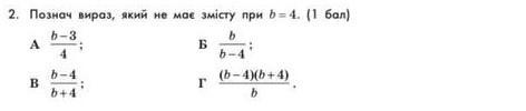 2. Познач вираз, який не мае змiсту при ь = 4. (1 бал) b b-3 4 b-4 A B b-4 6+1 B r ; (b-4)(b+4) 6