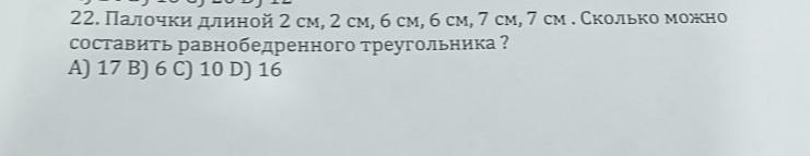 Палочки длиной 2 см, 2 см, 6 см, 6 см, 7 см, 7 см. Сколько можно составить равнобедренного треугольника?
