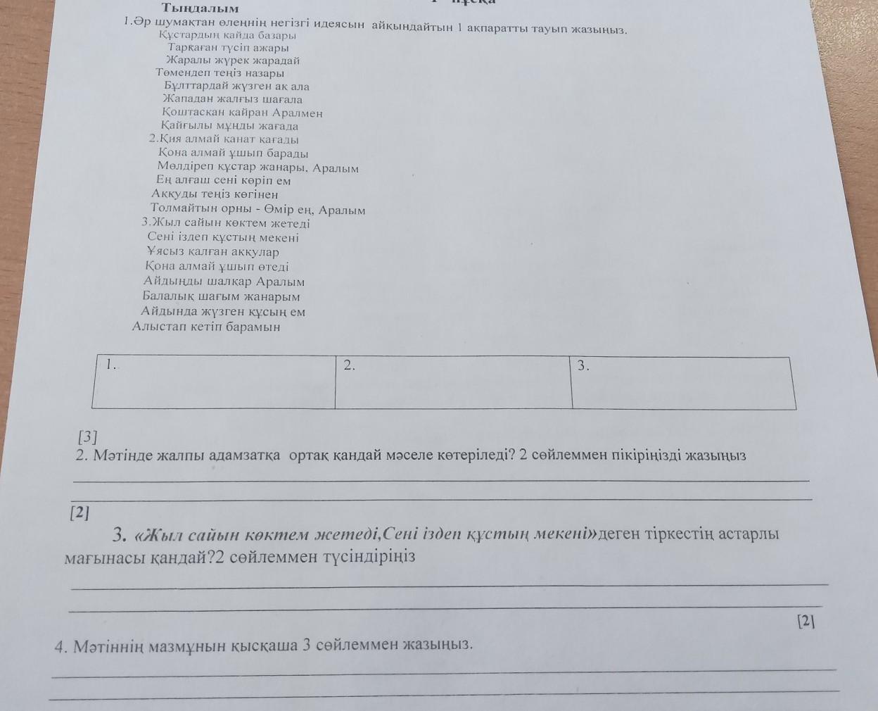 1.Әр шумактан өлеңнің негізгі идеясын айкындайтын 1 акпаратты тауып жазыныз.