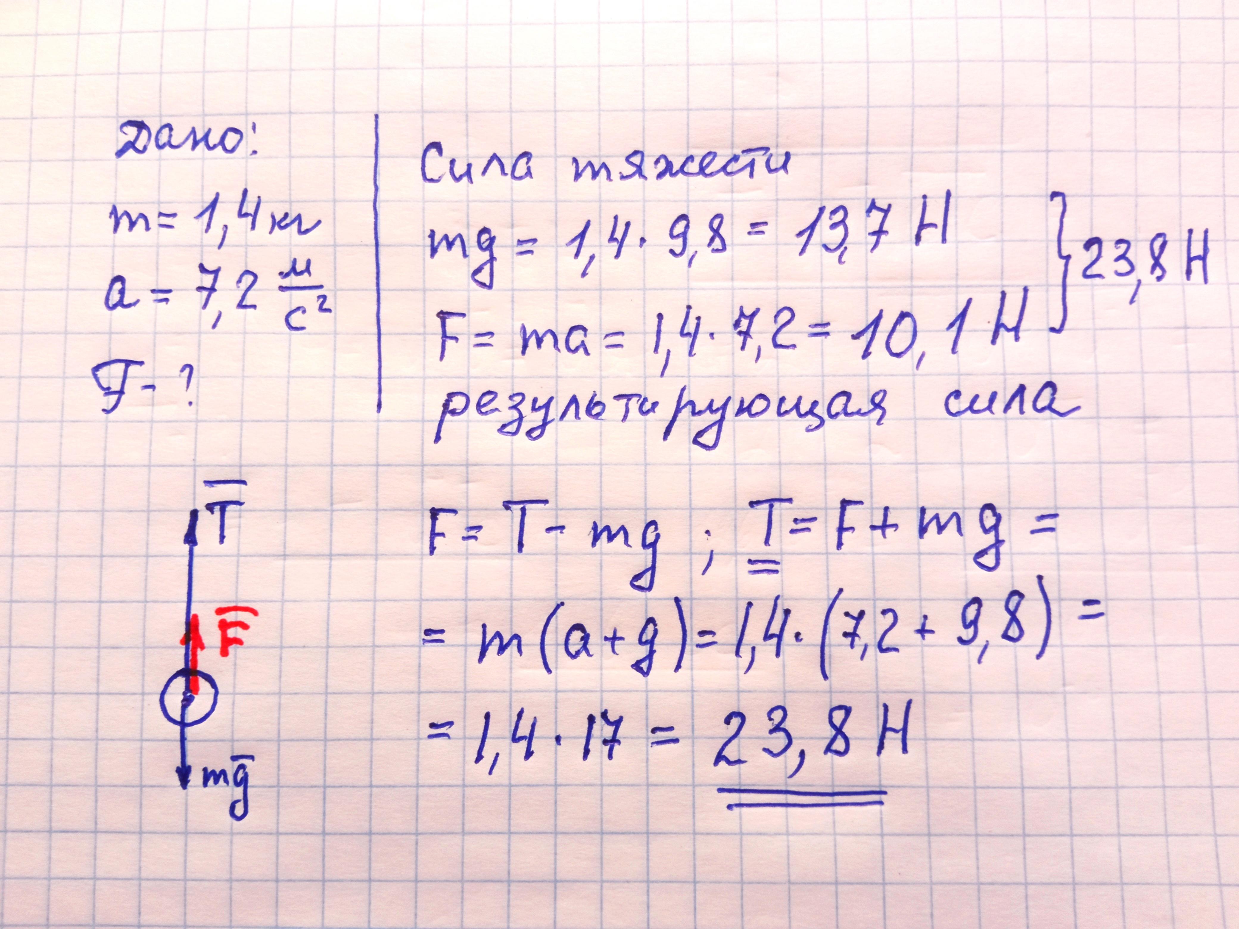 Груз массой 1,4 кг поднимают по вертикали с помощью нити с ускорением 7,2 м/СКВ. Найдите направление силы, которую необходимо приложить к центру груза.