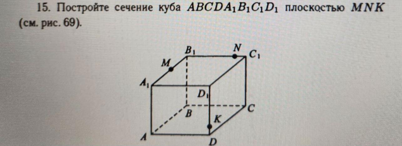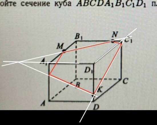 Продлим прямую MN и прямые D1C1; A1D1 до пересечения, точку К соединяем с данными пересечениями. А теперь соединяем плоскость сечения (обозначена красными линиями)