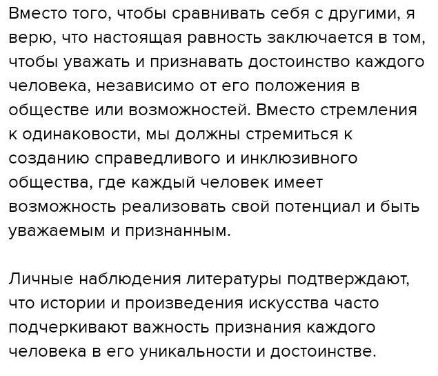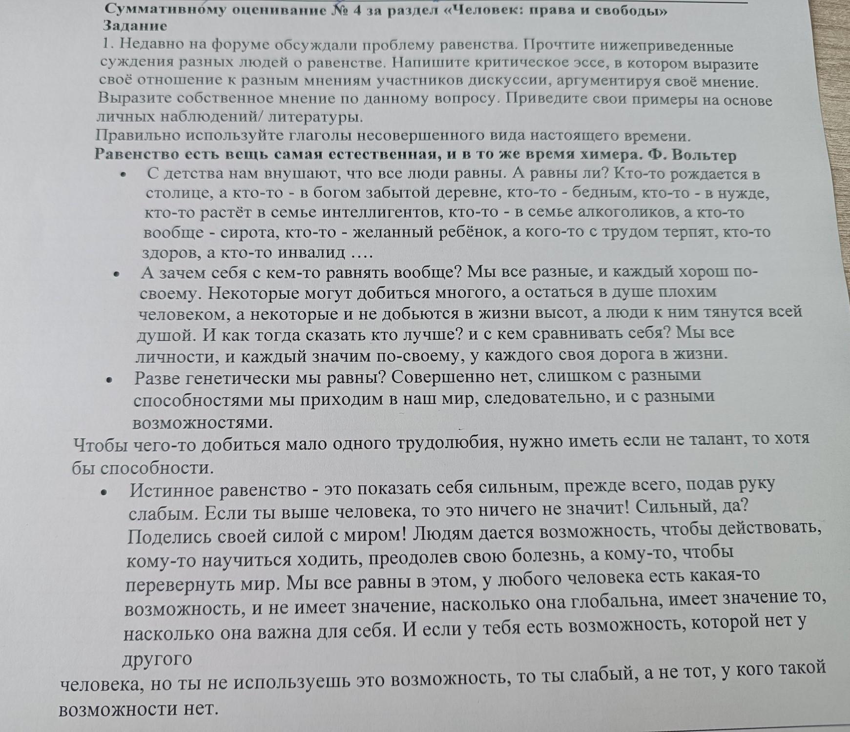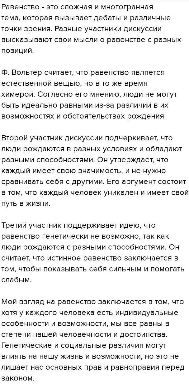 1. Недавно на форуме обсуждали проблему равенства. Прочтите нижеприведенные суждения разных людей о равенстве. Напишите критическое эссе, в котором выразите своё отношение к разным мнениям участников дискуссии, аргументируя своё мнение. Выразите собственное мнение по данному вопросу. Приведите свои примеры на основе личных наблюдений/ литературы. Правильно используйте глаголы несовершенного вида настоящего времени.