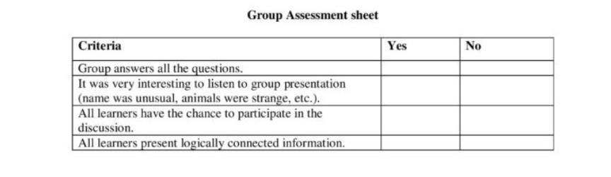 Group Assessment sheet Criteria Group answers all the questions. It was very interesting to listen to group presentation (name was unusual, animals were strange, etc.). All learners have the chance to participate in the discussion. All learners present logically connected information. Yes No