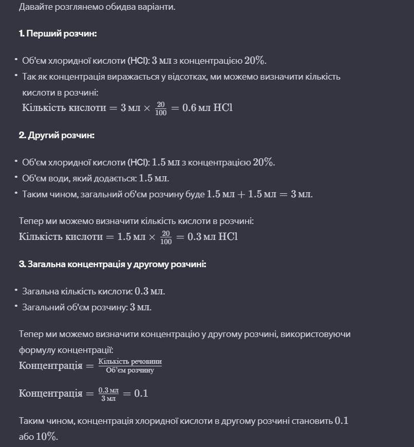 Підготуйте два розчини хлоридної кислоти: один – 3 мл 20%, другий – до 1,5 мл 20% додайте стільки ж води.