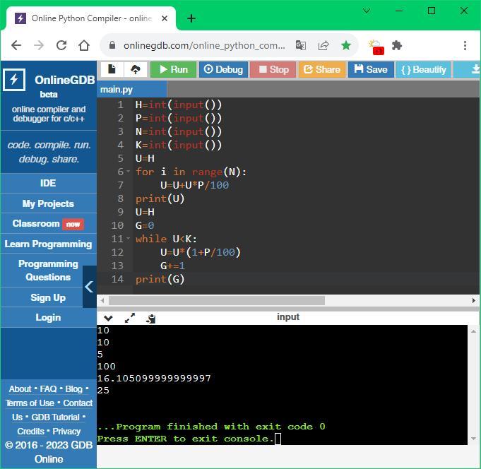 Перед початком повені рівень води у річці становив Н м. Під час повені • кожну годину рівень води зростав на Р% від рівня попередньої години. Яким буде рівень води через N годин після початку повені? Через скільки годин після початку повені рівень води буде не менше, ніж К м?