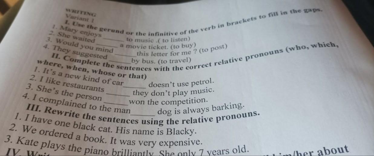 1 i have one black cat whose name is blacky. 2 we ordered a book which was very expensive 3. kate who is only 7 y.o. plays the piano brilliantly